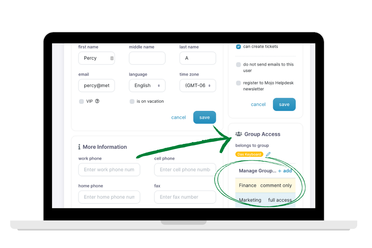 Groups (for contacts) can be used for reporting and for ticket sharing. Within a group, a contact can be given permissions to view and comment on tickets entered by someone else in the same group. Groups are nothing new, however a contact could only see tickets in one group. Here's where Group Access comes in. Managers of the help desk can grant group access to a contact for multiple groups.