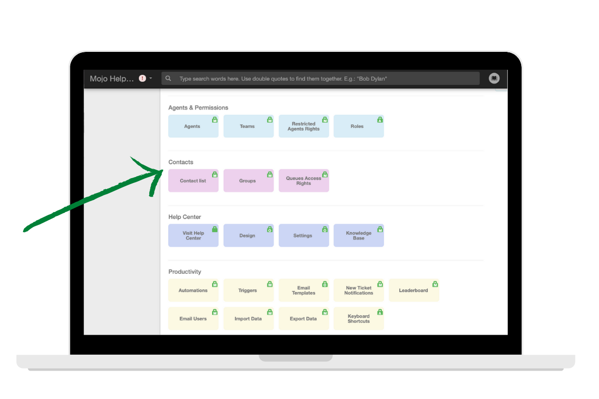 Notice that the applicable settings for each type of user are also clearly categorized. The Agent section has the Agent list, Teams and Restricted Agents Rights. Meanwhile, Contacts contain the Contact list, Groups and Queue Access Rights.