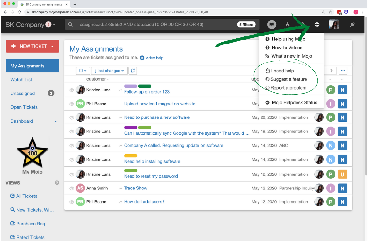 We've also made it easier for Mojo customers to ask us a question. The help icon is found to the left of the profile. The raised hand, the smiley face or the sad face all open a ticket in our helpdesk. Need any help? We're two clicks away.