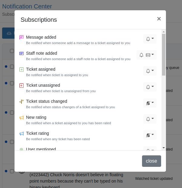 All notifications are centralized in one place. Agents can choose to be notified by email or web only by subscribing to “topics” such as ticket creation, ticket updates, ticket rating, new staff added and more.