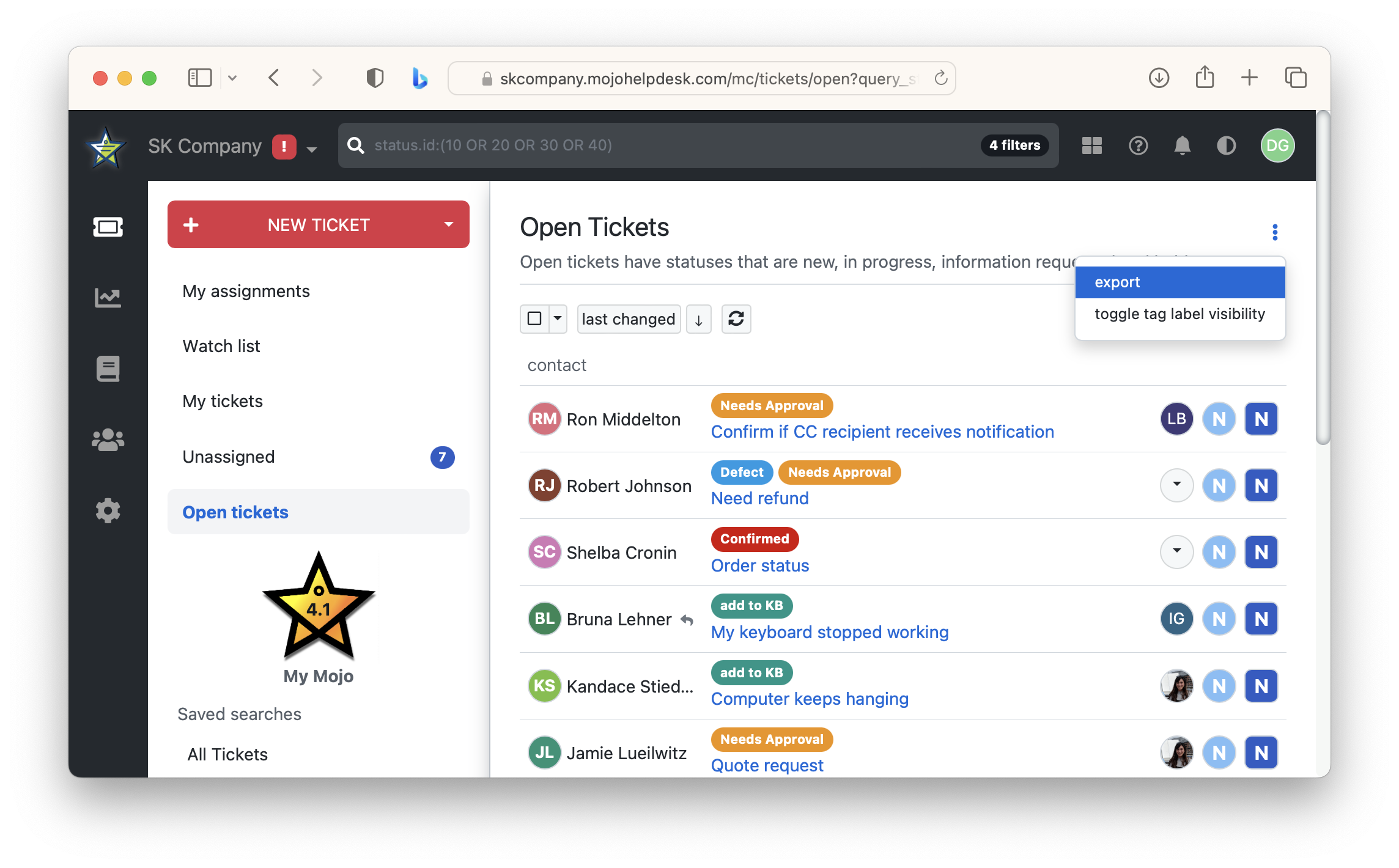 Did you know one can export any ticket list in CSV format? Use the ticket list option menu: