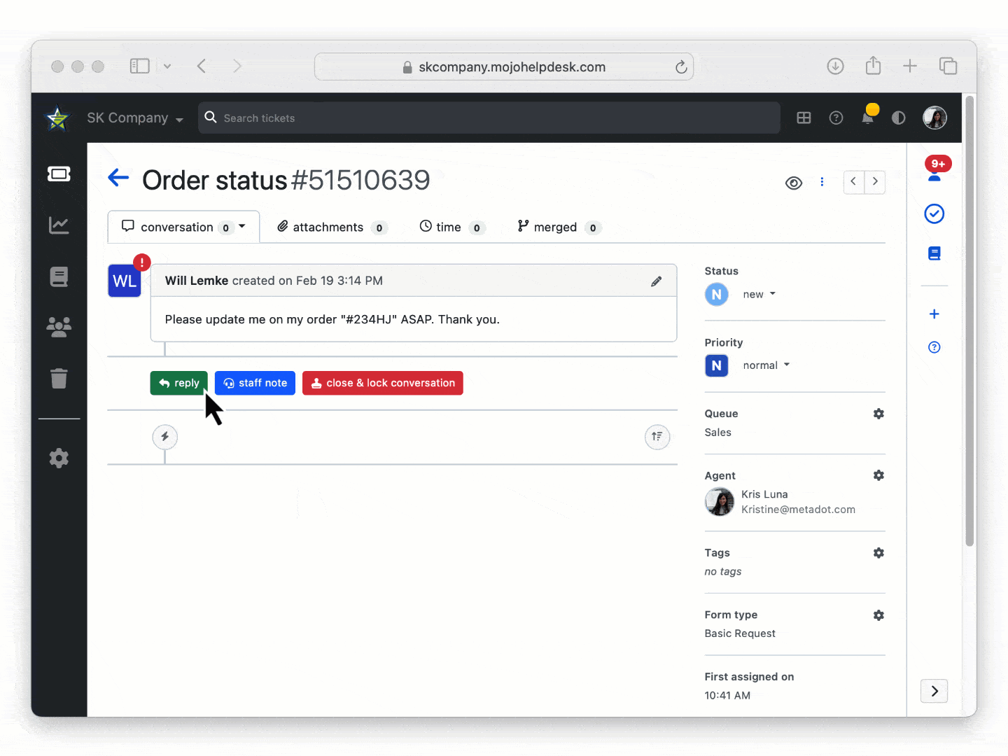 Answer tickets faster with canned responses. Agents can use pre-made replies to respond quickly and consistently to common questions.