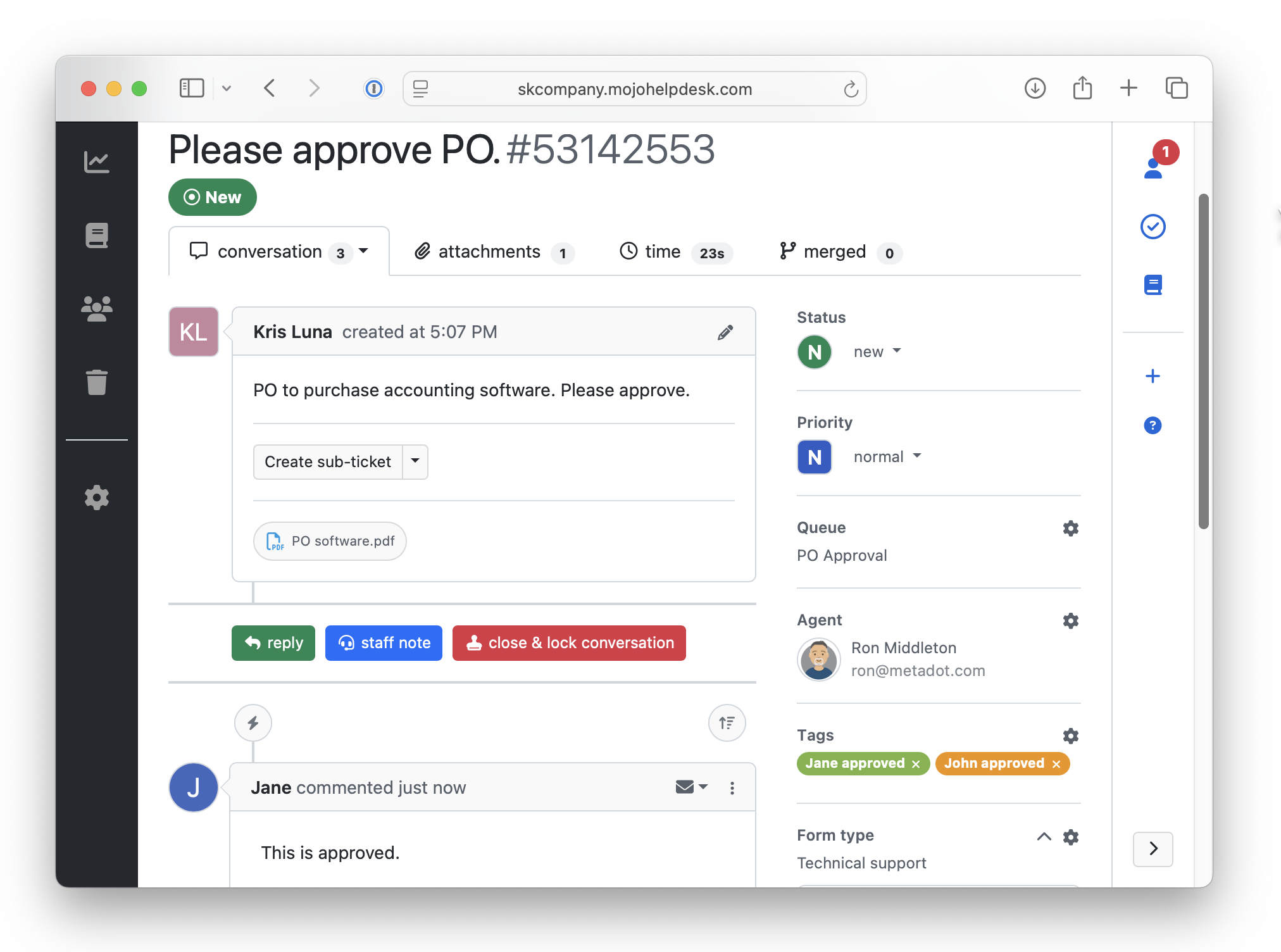 This setup creates a simple, trackable approval flow. Ticket tags provide an at-a-glance view of who has approved, and approvers can reply directly from their inbox.