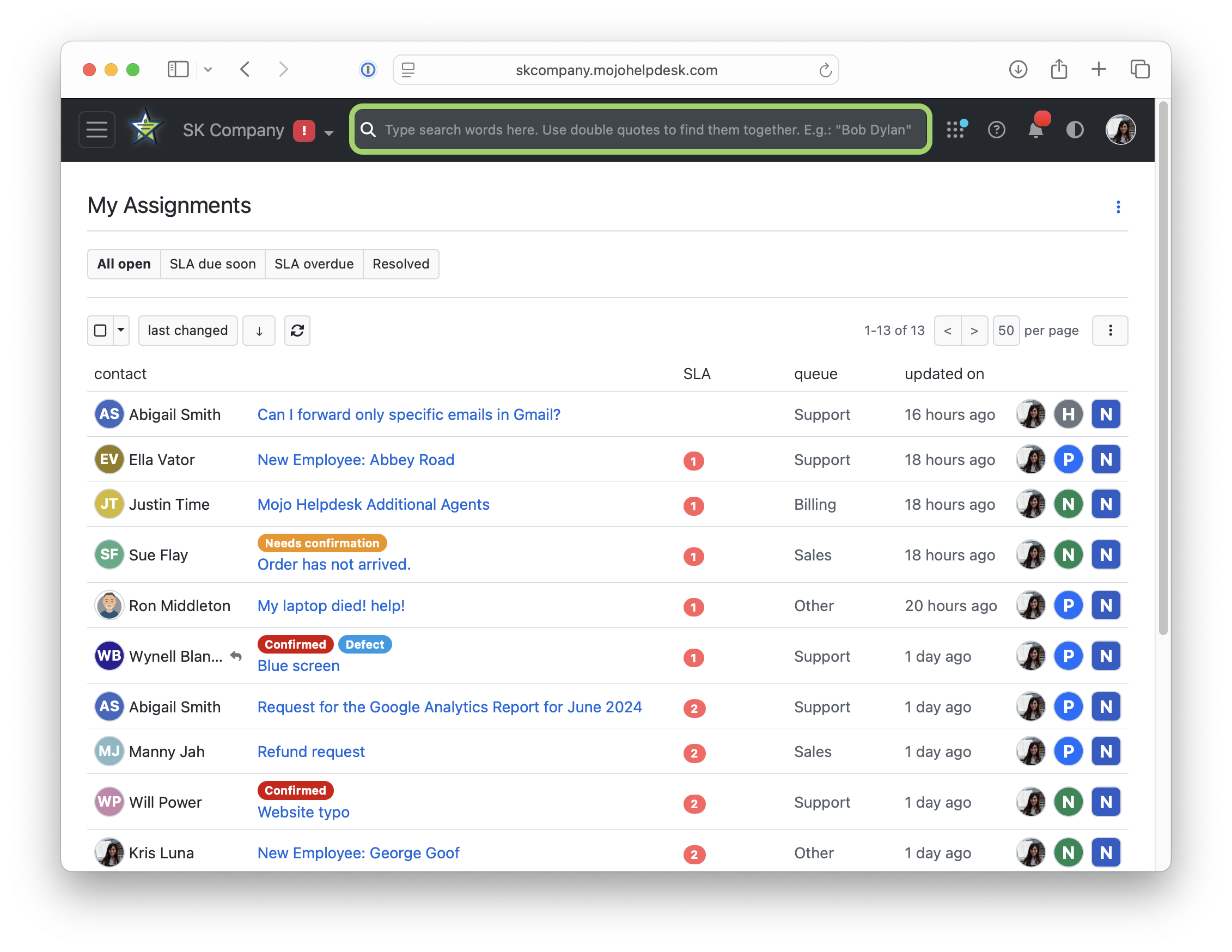 - “Authentication error" → Finds tickets the mentions the exact phrase “authentication error”